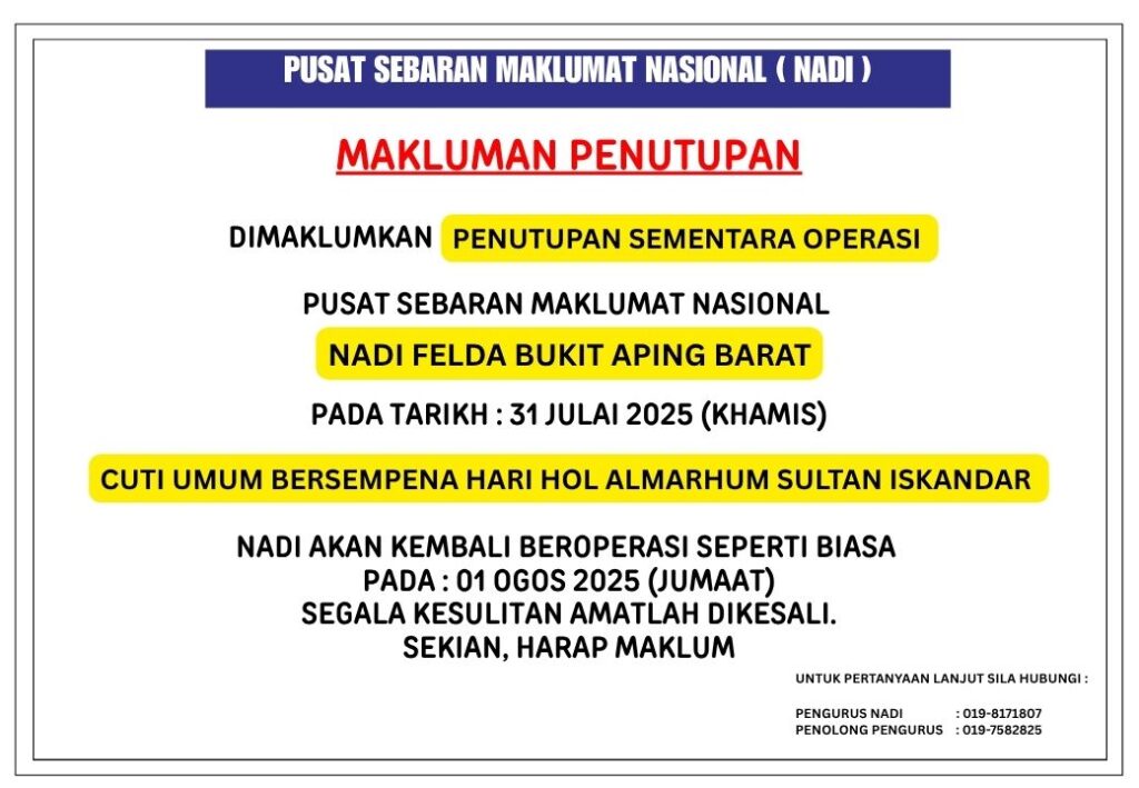 JULAI 2025 | NOTIS PENUTUPAN SEMENTARA SEMPENA HARI HOL ALMARHUM SULTAN ISKANDAR