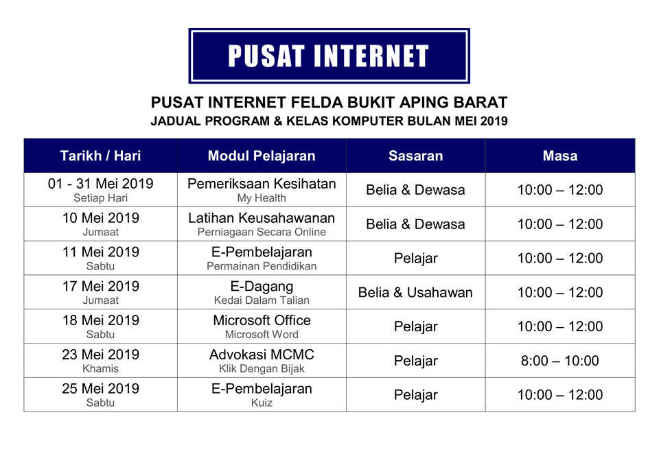 Tarikh : 23 Febuari 2019 Masa : 9.00 Pagi Sehingga 1.00 Petang Lokasi : Pusat internet Felda Bukit Aping Barat Peserta : 8 Orang Tujuan : Para pelajar dilatih untuk mengunakan kemahiran asas dalam Microsoft Office Power Point.Dengan […]