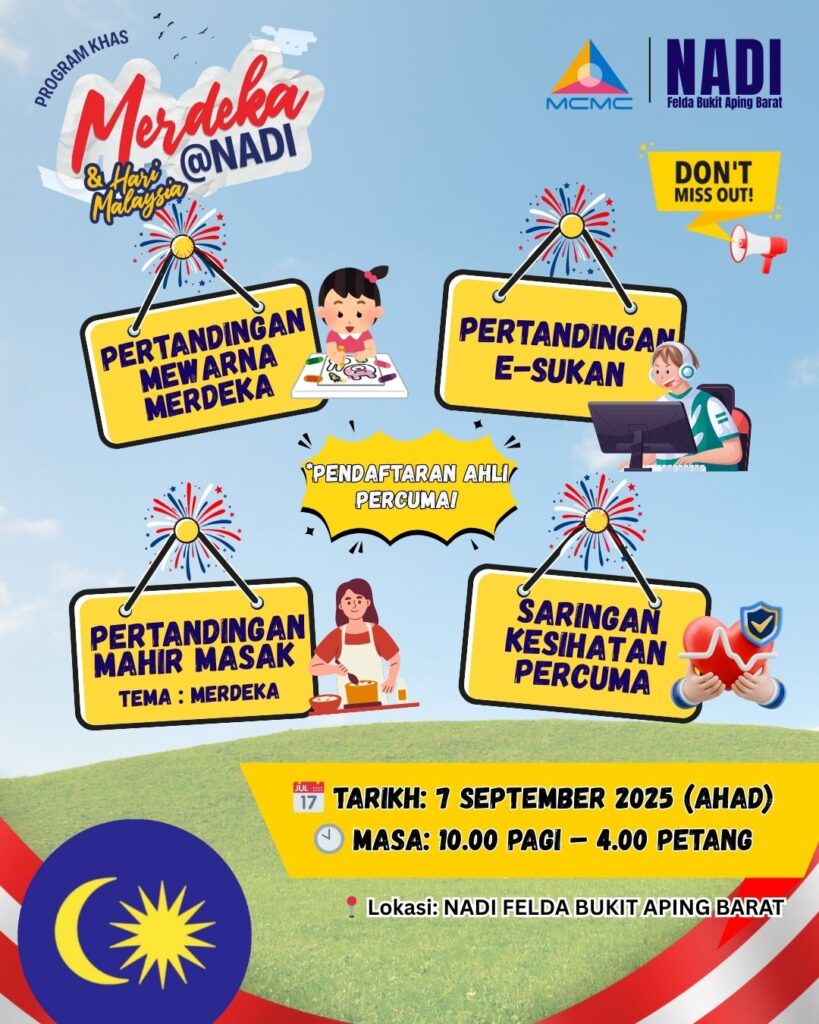 NADI Felda Bukit Aping Barat telah berjaya melaksanakan program Merdeka & Hari Malaysia pada 7 September 2025 (Ahad) bertempat di premis NADI. Program ini telah berlangsung dengan lancar dari jam 10.00 pagi hingga 4.00 petang dan menerima kehadiran yang amat menggalakkan daripada komuniti setempat.